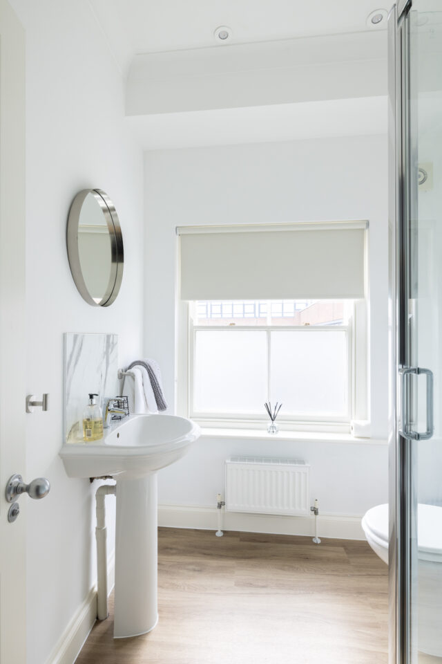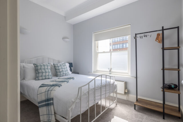 Just off the living room is a minimal white bathroom with a walk-in shower. A good-sized bedroom is at the back of the accommodation with space to hang your clothes.